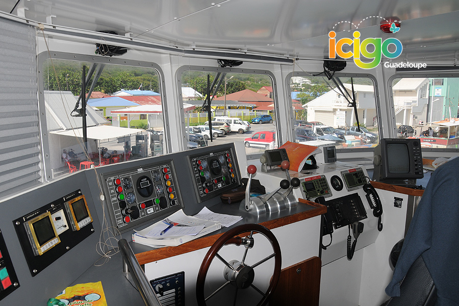 L'Archipel 1 est accosté sur le ponton de la gare maritime de Saint-François près du port de pêche et de l’église et face au centre commercial les comptoirs de Saint-François.