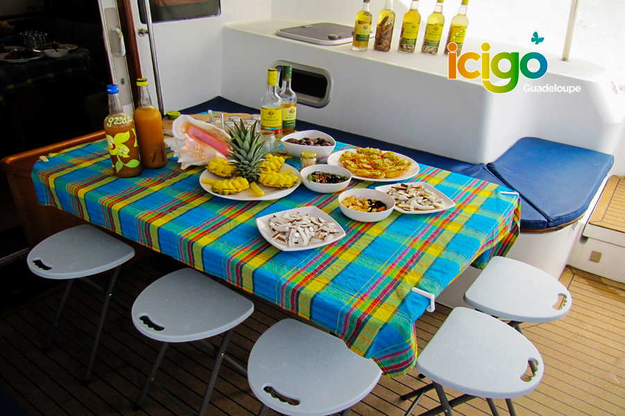 Après cette parenthèse magique, retour sur le catamaran pour un vrai moment “VIP” : apéritif à bord, puis déjeuner servi sur le bateau, dans une ambiance conviviale, face aux paysages des Saintes.